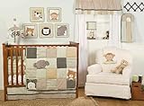 The Bear and Buddies 6 Piece Nursery Crib Set features a animal design theme that includes accents of bears, elephants, rabbits, lions, zebras and monkeys in a neutral color scheme of gray, taupe, sage green and cream. The nursery bedding set includes a crib quilt, crib bumper, dust ruffle, diaper stacker, fitted crib sheet and window valance.