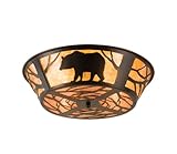 With roots in the foothills of New York's Adirondack Mountains, the Meyda Design Team draws inspiration from wildlife, floral beauty and art history. A Black bear strolls through the woods on this nature inspired flushmount. The fixture is finished in Black and has Amber Mica panels. Every Meyda Tiffany item is a unique, handcrafted work of art. Natural variation in the glass and finish make each and every one a masterpiece all its own. Photographs are a general representation of the product. Colors will vary. Requires 4 100w Medium bulbs. (Not Included) Free Shipping! Dimensions: Total Height: 7.5" Total Width: 22" Shade: 5.5" H x 22" W